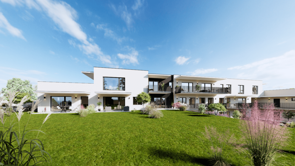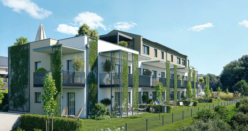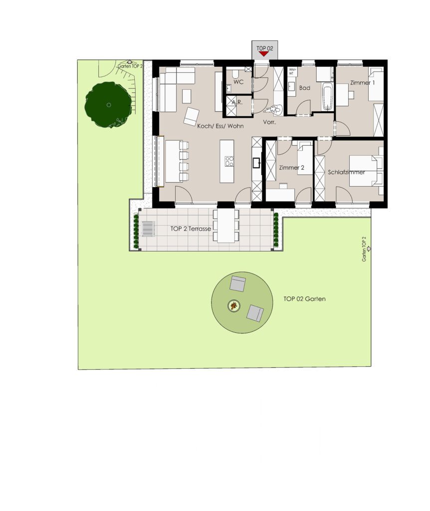 Diese ca. 72 m² große Erdgeschosswohnung bietet zwei Schlafzimmer, eine offene Wohnküche sowie durchdachte Nebenräume. Eine Terrasse mit rund 16 m² und zwei Gartenflächen mit insgesamt über 108 m² plus zusätzlichem Vorbereich von ca. 26 m² schaffen viel Platz im Grünen und erweitern den Wohnraum großzügig nach außen.