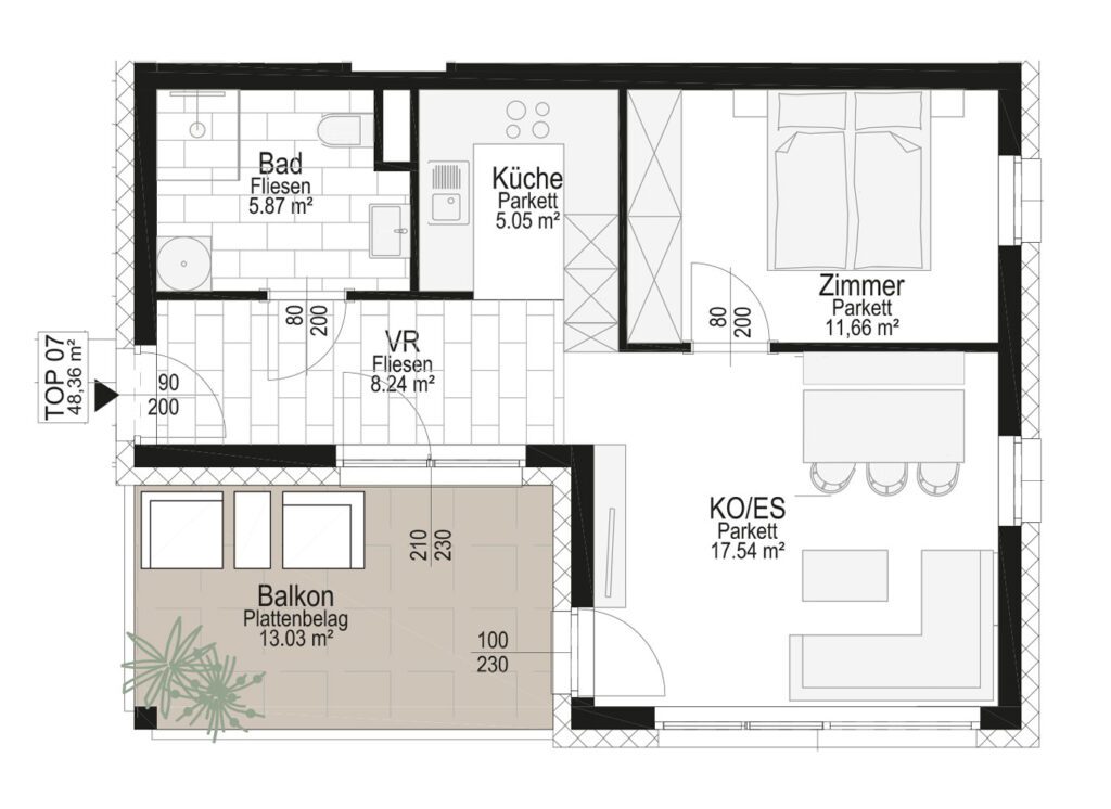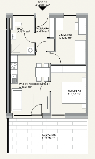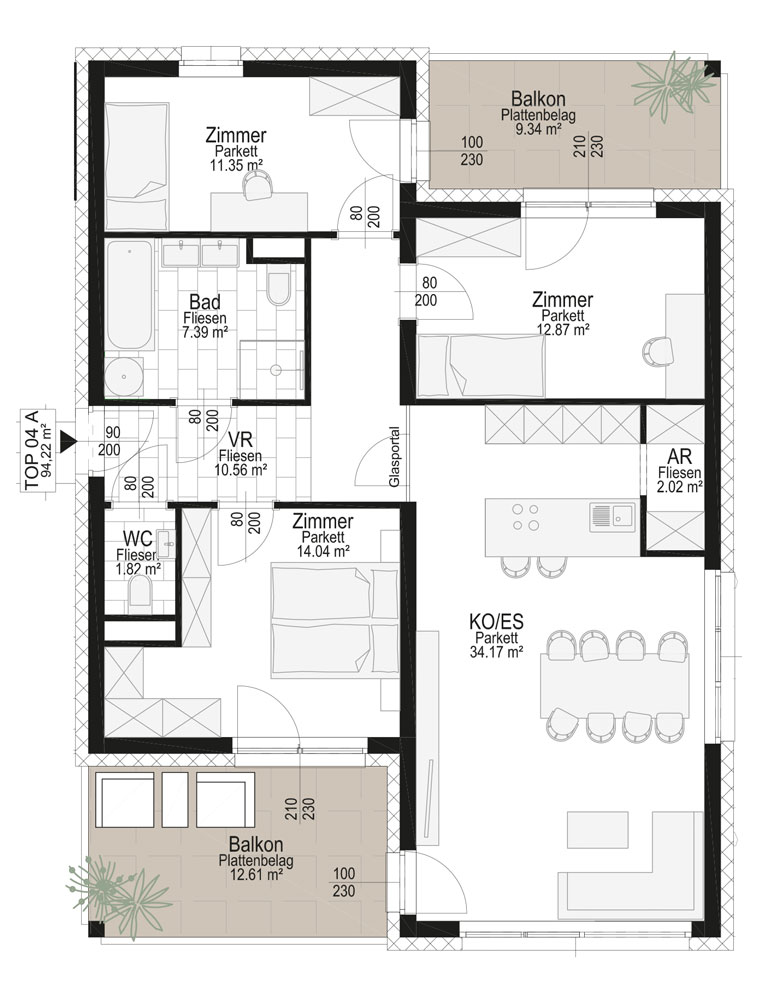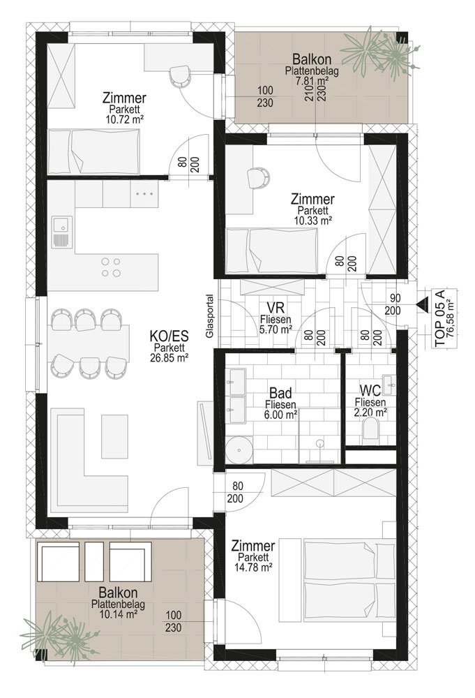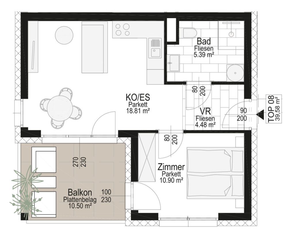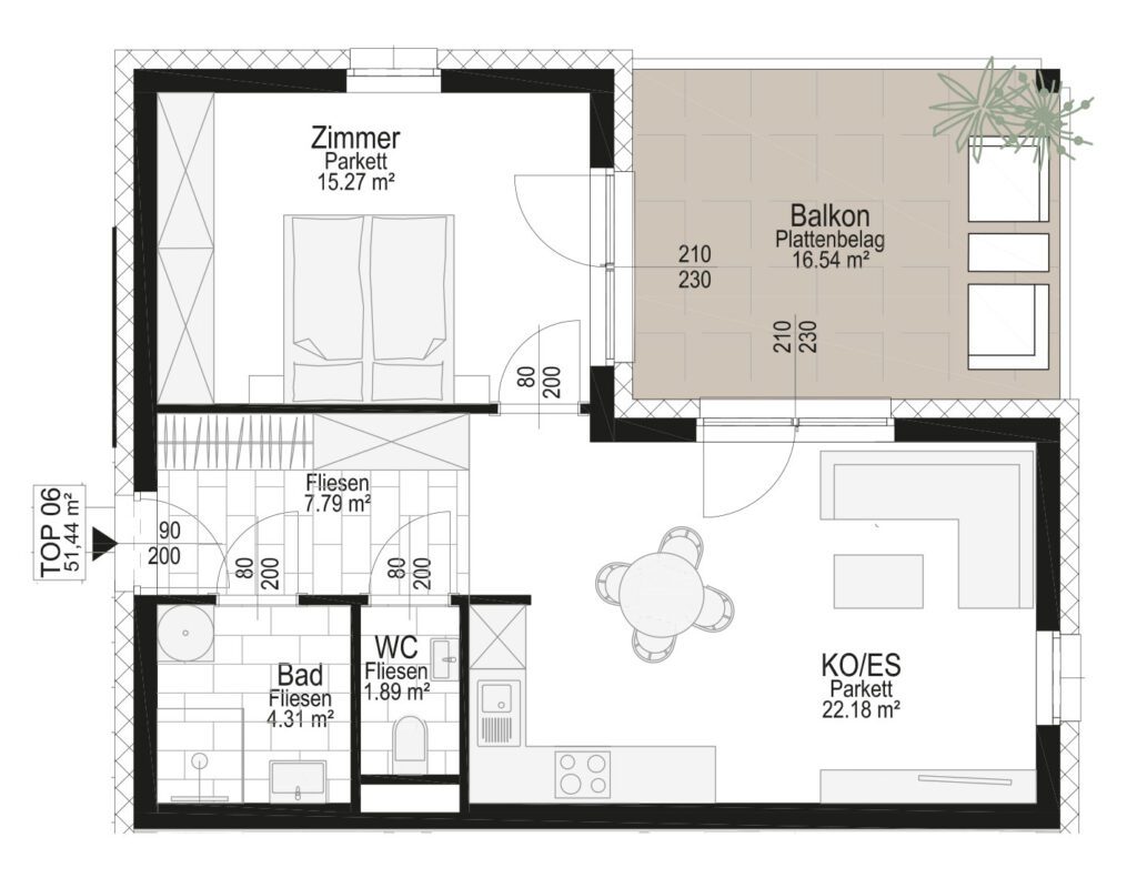 Die Wohnung Top 08/09 mit einer Fläche von 82,9 m² und drei großzügigen Balkon mit zusammen 29,57 m² bietet eine geräumige und einladende Wohnlösung. Der Wohnbereich ist komfortabel und gut gestaltet, was Top 08/09 zu einer idealen Wahl für Paare und kleine Familien macht. Die großzügigen Balkone bieten zusätzlichen Platz im Freien und die Möglichkeit, die frische Luft und die Sonne zu genießen.