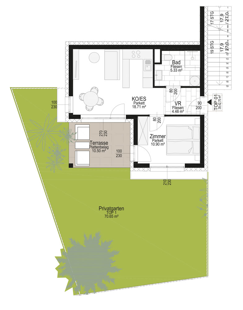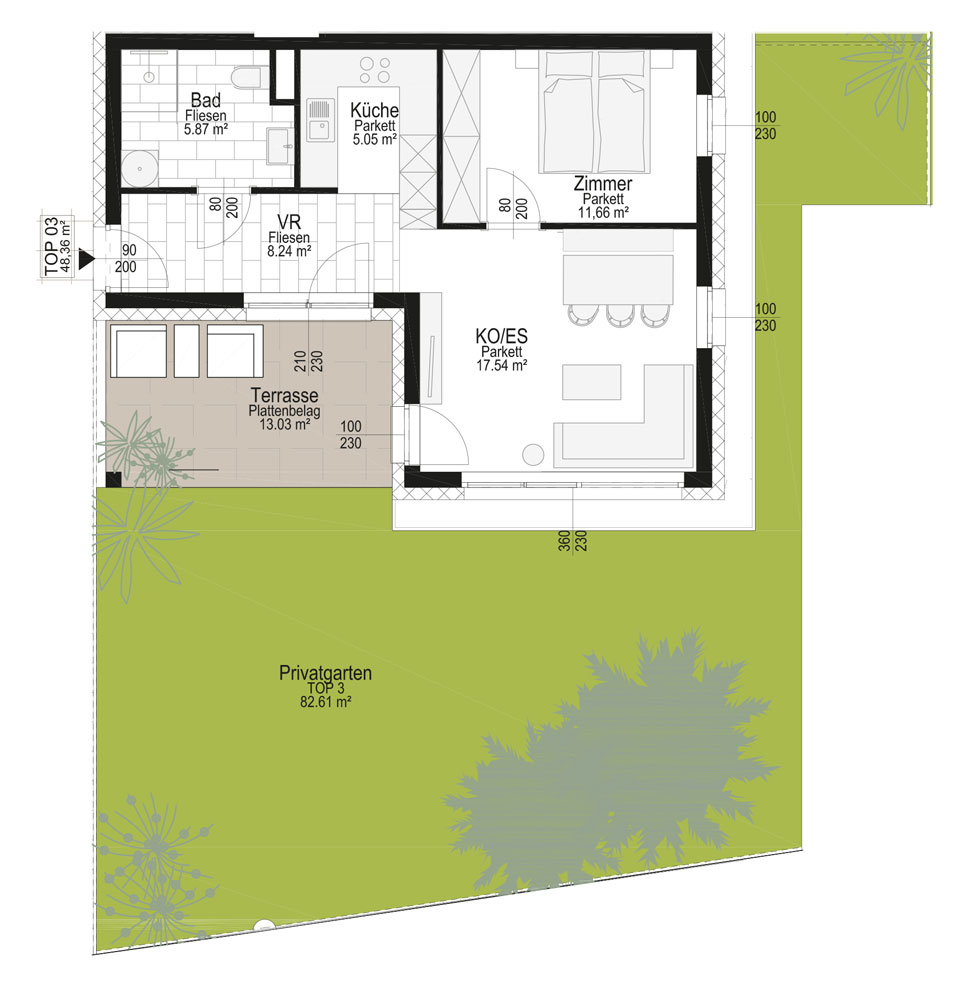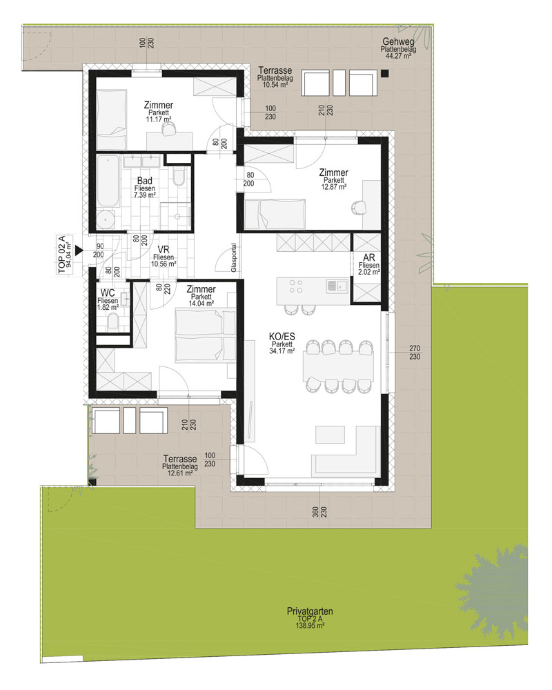 Die Wohnung Top 01 im Erdgeschoss bietet auf 75,41 m² ein durchdachtes Wohnkonzept mit zwei hellen Schlafzimmern, einem großzügigen Wohn-, Ess- und Küchenbereich sowie einem modernen Bad und separatem WC. Die 14,21 m² große Terrasse und der 58,36 m² große Garten schaffen ein ideales Umfeld für Familien oder Paare, die das Leben im Freien genießen möchten.