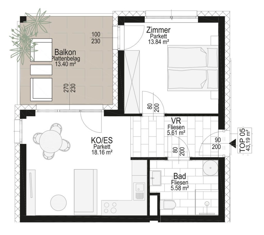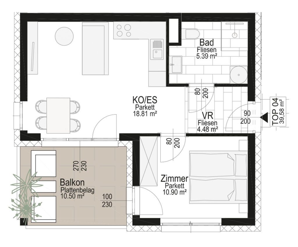 Diese ca. 43 m² große Wohnung verfügt über einen offenen Wohn-/Essbereich, ein geräumiges Schlafzimmer, Bad und Vorraum. Der großzügige Balkon mit über 13 m² bietet sonnige Erholungsfläche im Freien.