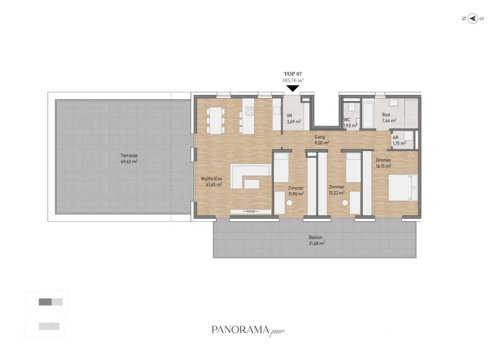 Diese ca. 106 m² große Wohnung im 1. Obergeschoss überzeugt mit drei Schlafzimmern, einer großzügigen Wohnküche mit über 41 m² sowie durchdachter Raumaufteilung. Eine rund 70 m² große Terrasse und ein zusätzlicher Balkon mit ca. 32 m² schaffen ein außergewöhnlich großzügiges Freiluftangebot.