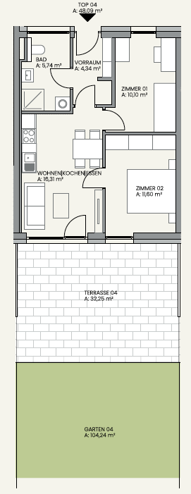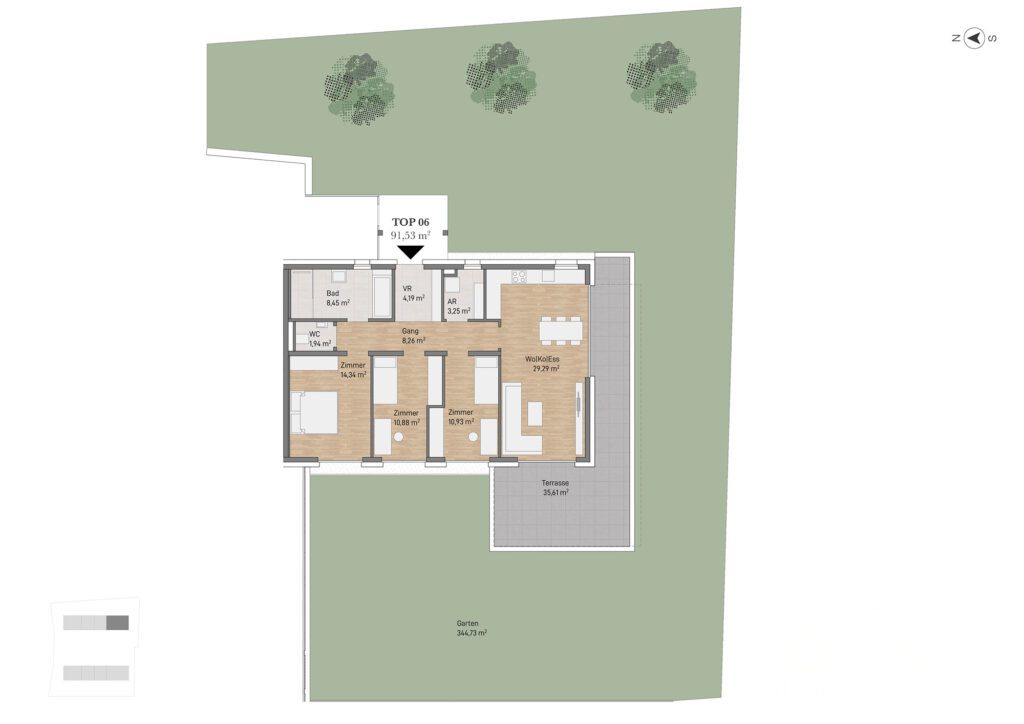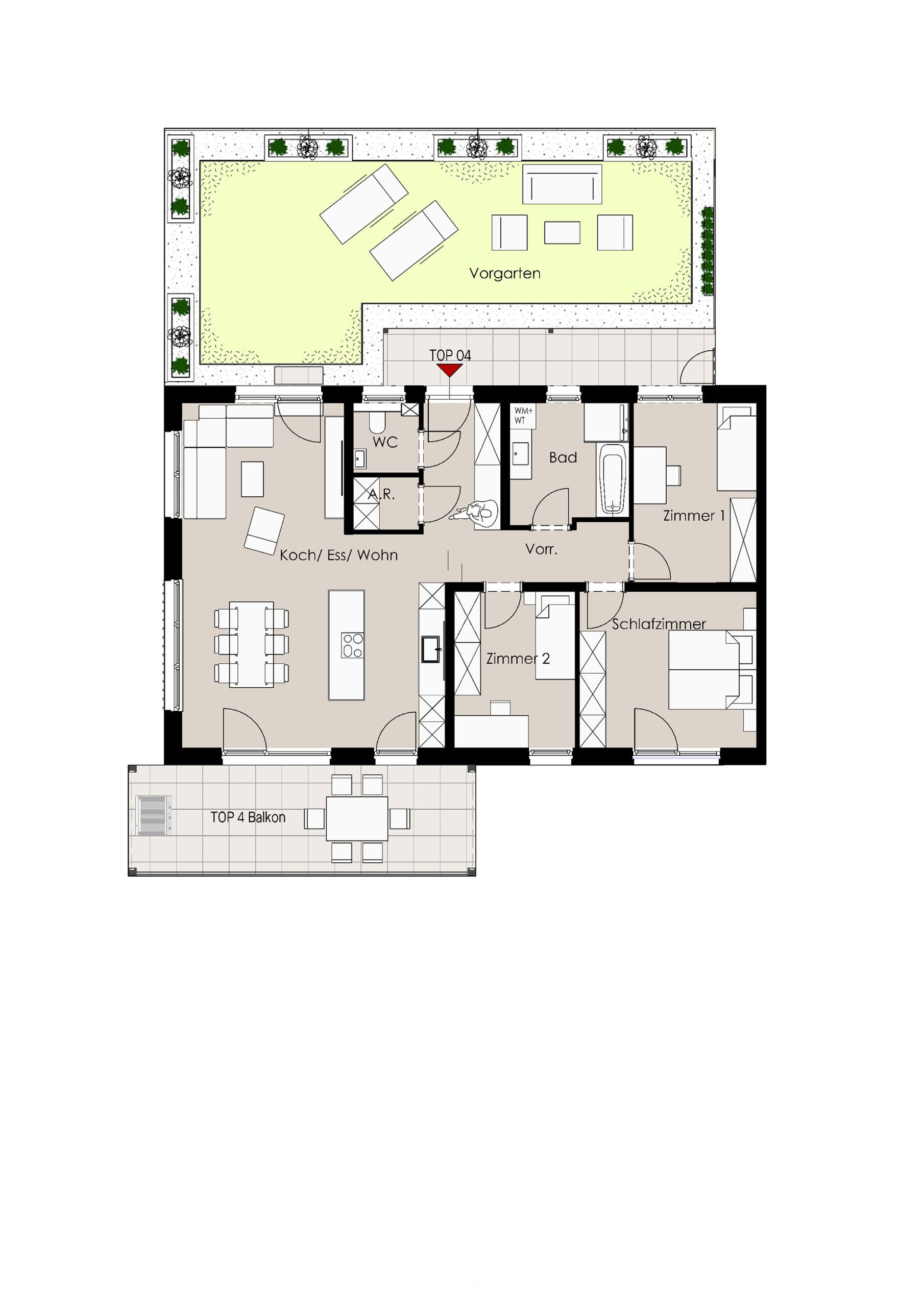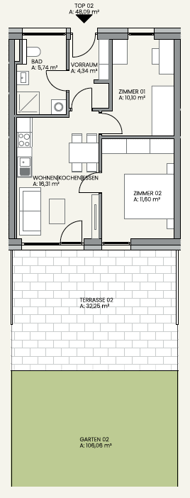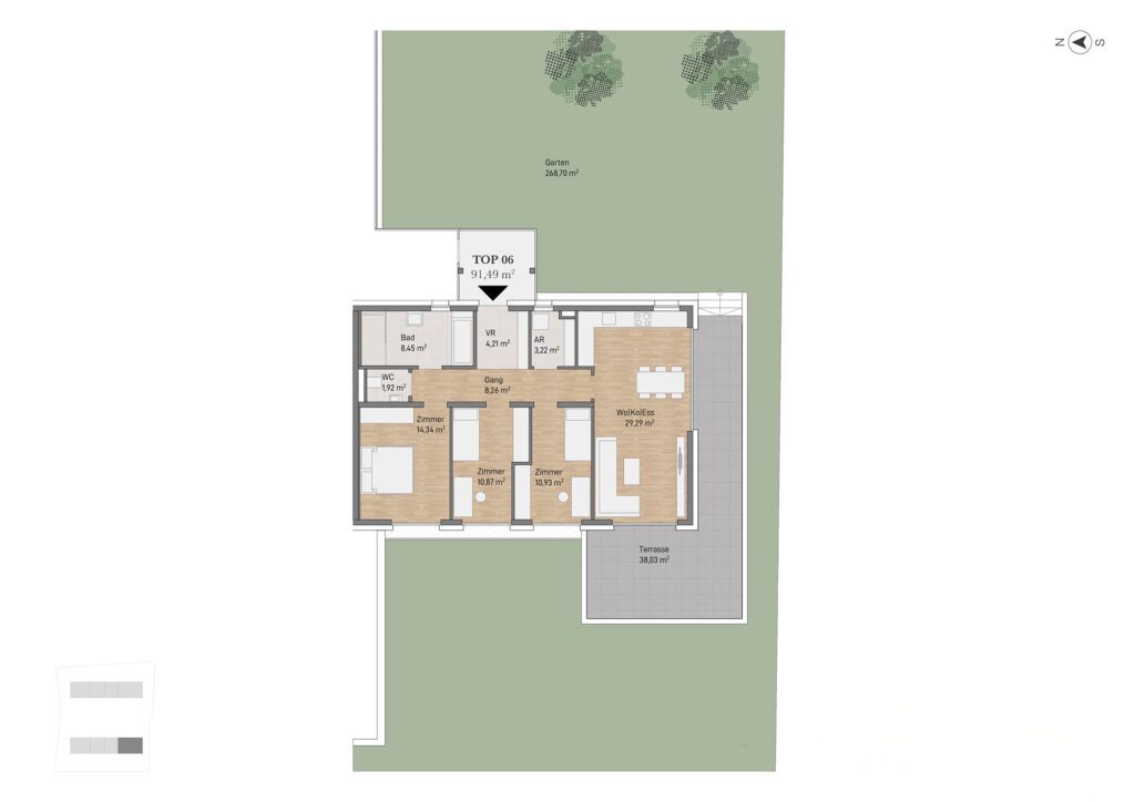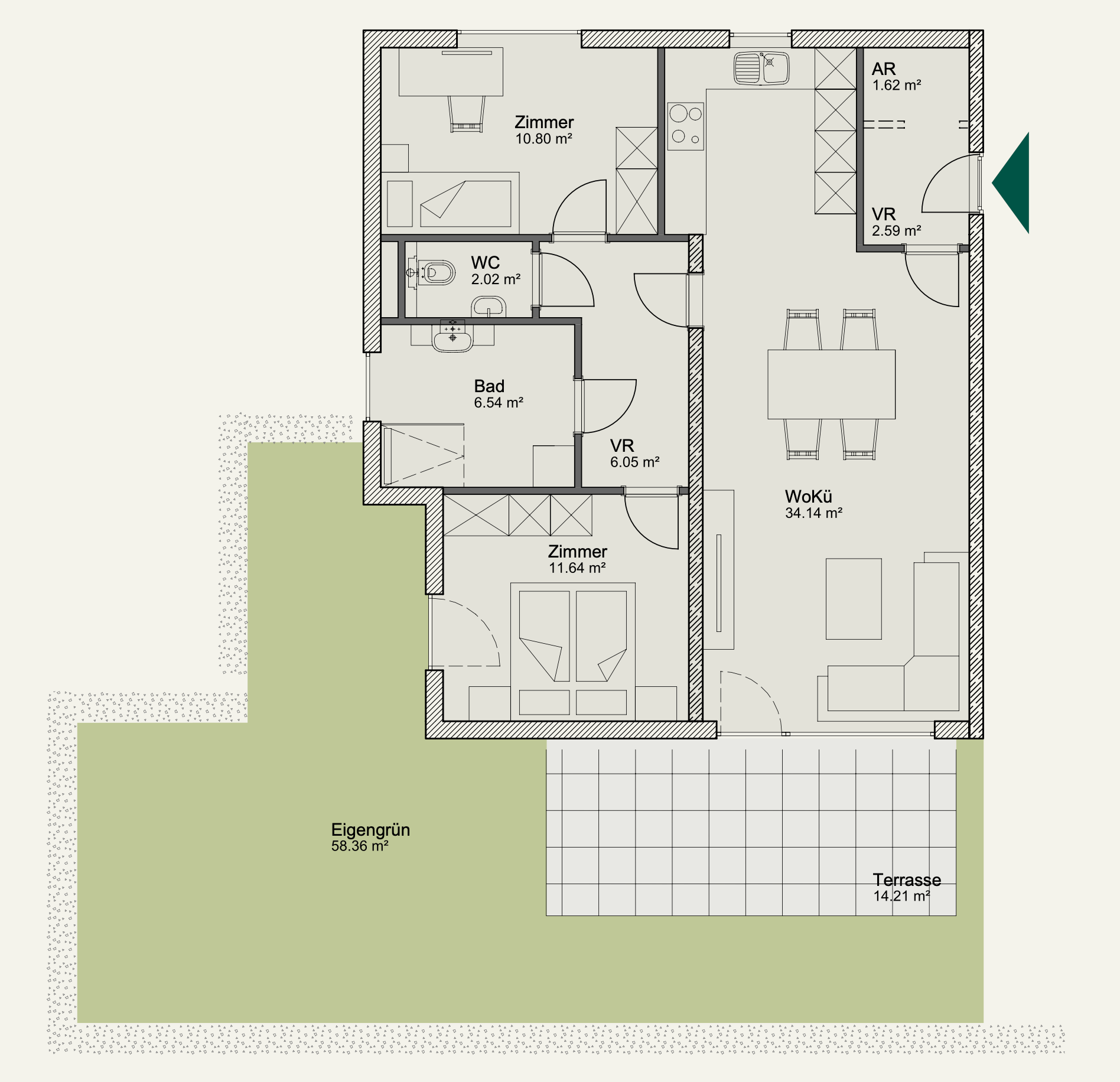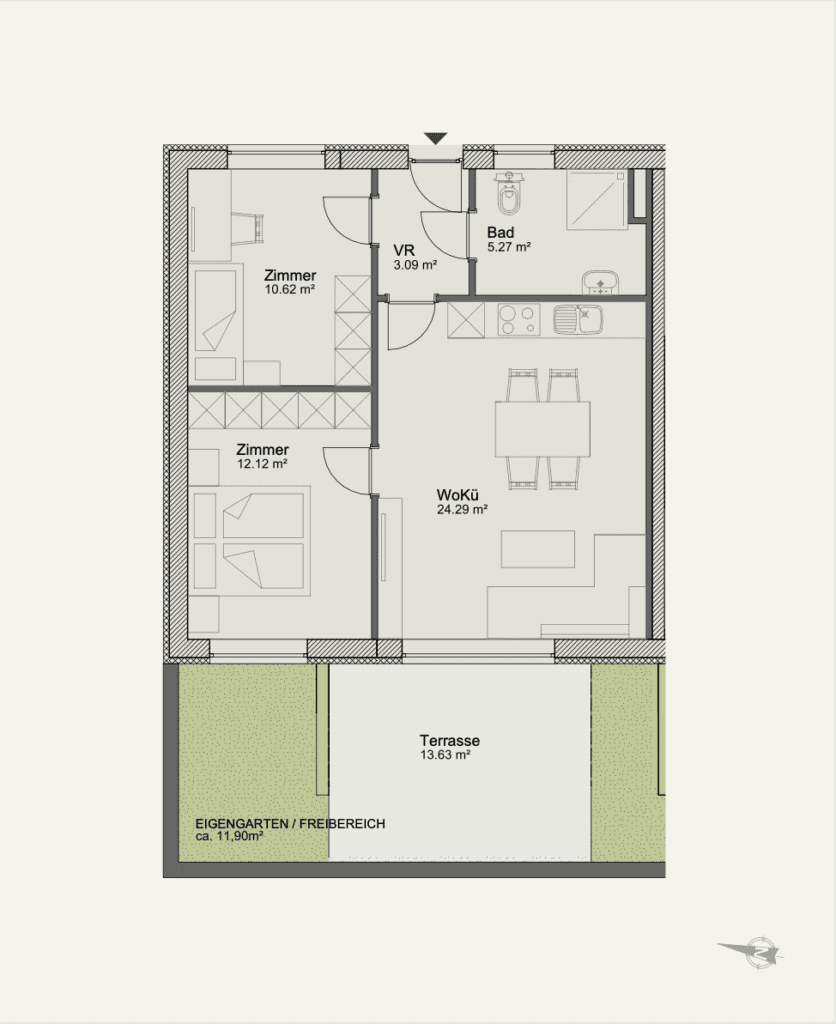 Diese ca. 72 m² große Erdgeschosswohnung bietet zwei Schlafzimmer, eine offene Wohnküche sowie durchdachte Nebenräume. Eine Terrasse mit rund 16 m² und zwei Gartenflächen mit insgesamt über 108 m² plus zusätzlichem Vorbereich von ca. 26 m² schaffen viel Platz im Grünen und erweitern den Wohnraum großzügig nach außen.