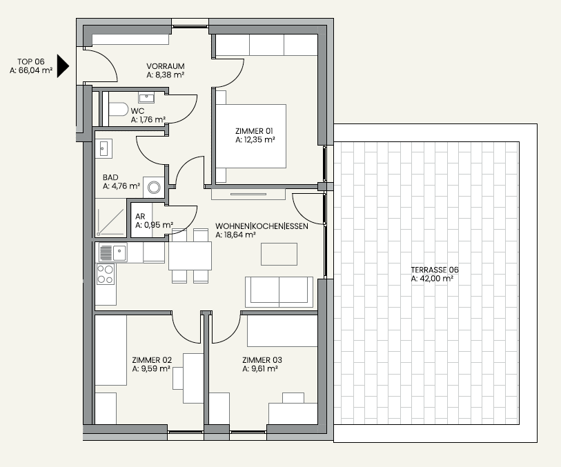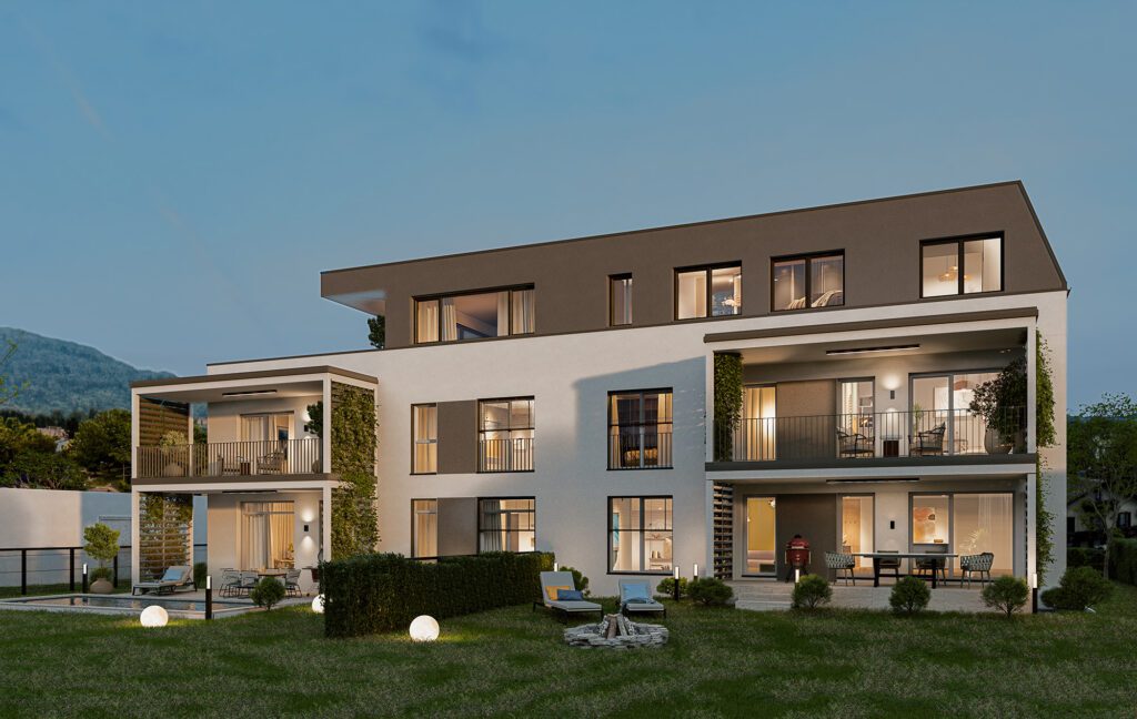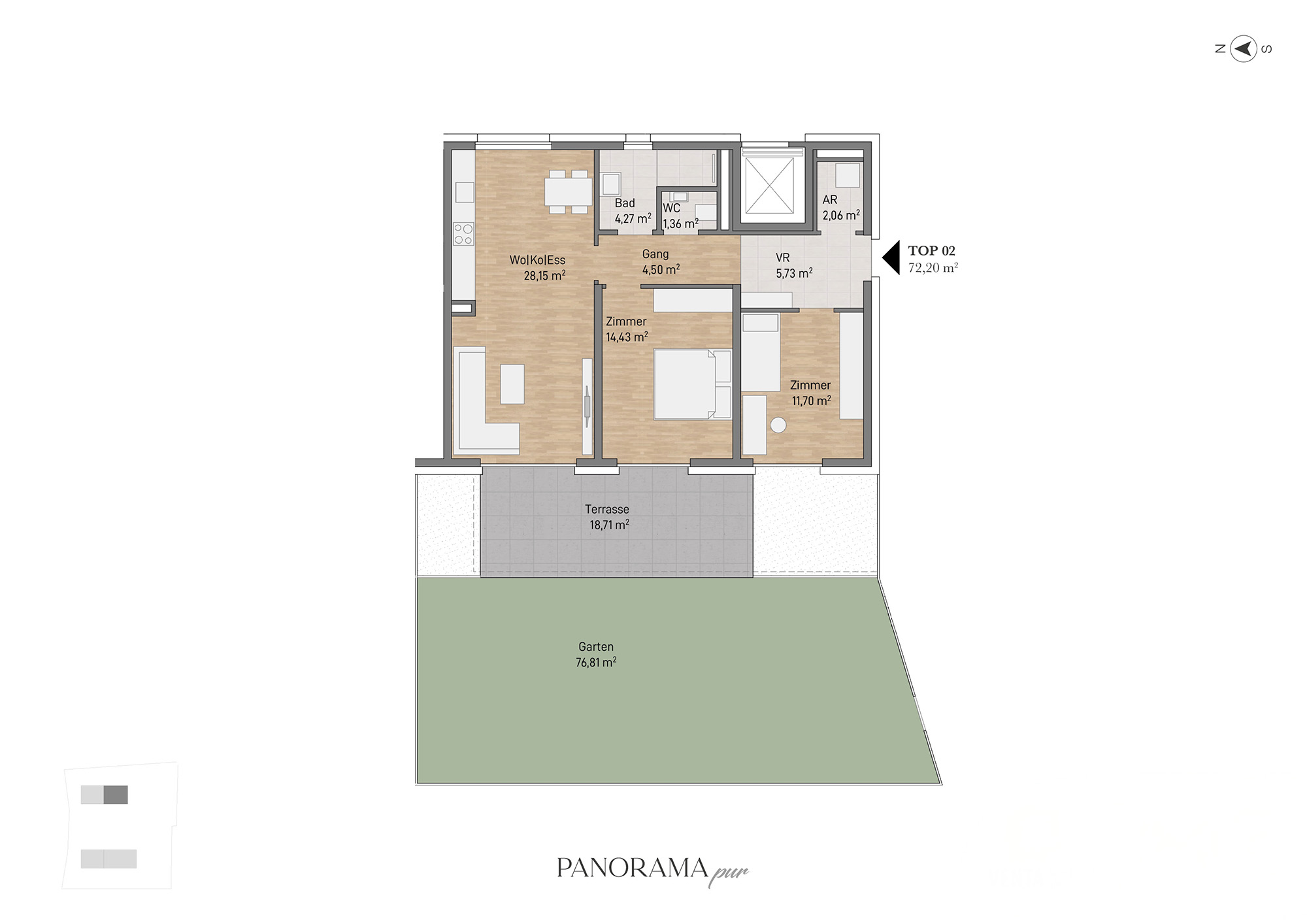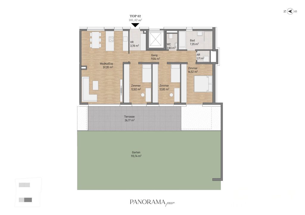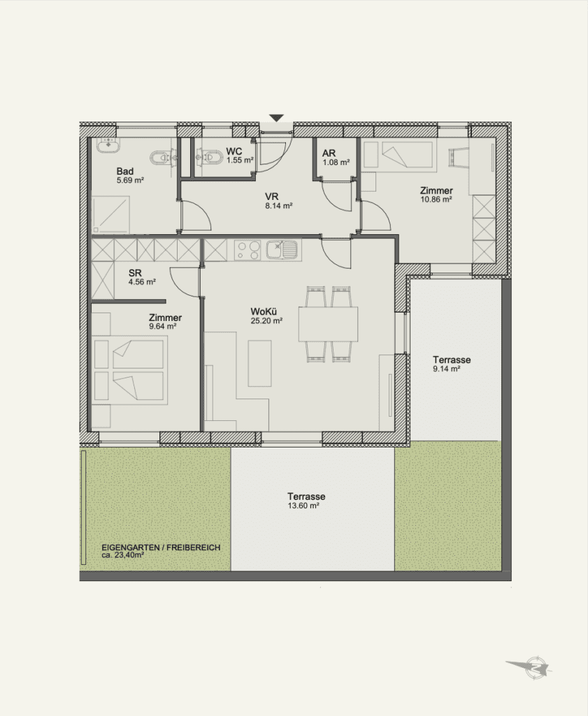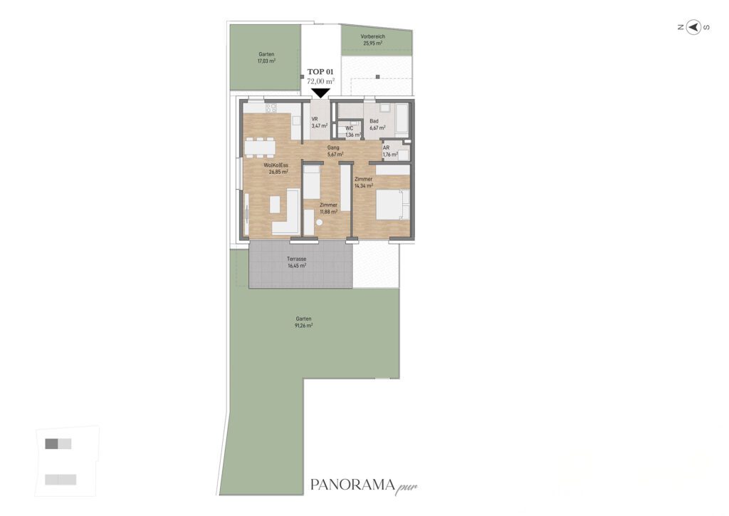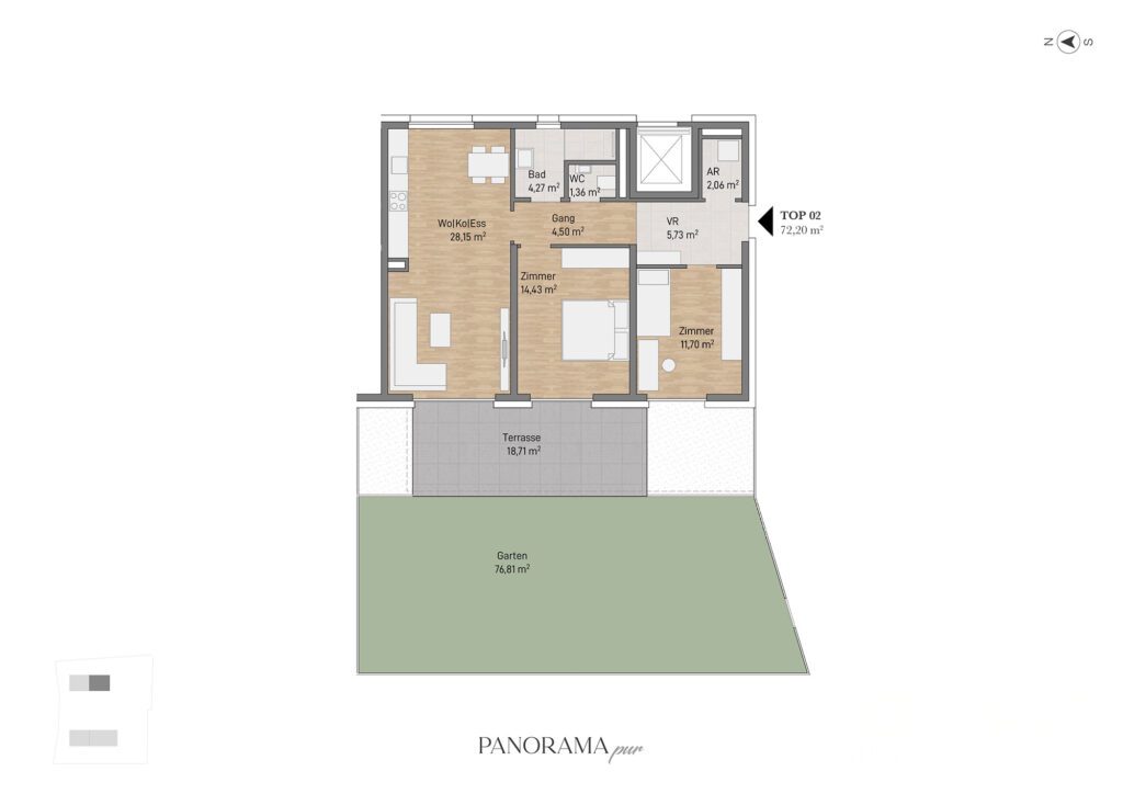 Diese ca. 72 m² große Erdgeschosswohnung bietet zwei Schlafzimmer, eine offene Wohnküche sowie durchdachte Nebenräume. Eine Terrasse mit rund 16 m² und zwei Gartenflächen mit insgesamt über 108 m² plus zusätzlichem Vorbereich von ca. 26 m² schaffen viel Platz im Grünen und erweitern den Wohnraum großzügig nach außen.