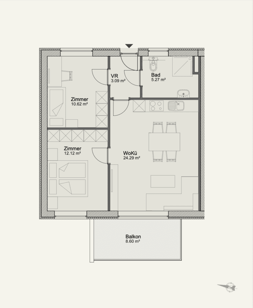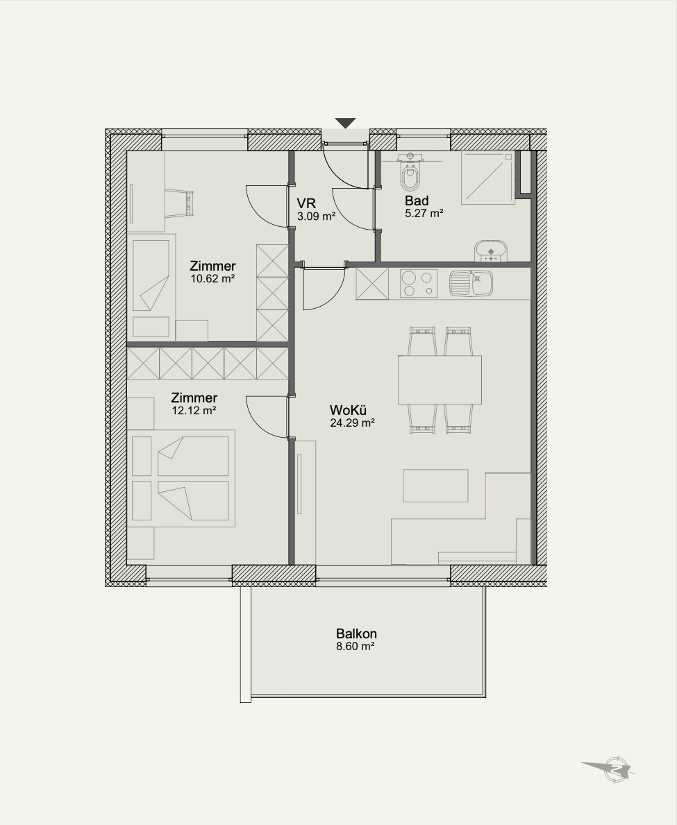 Diese ca. 72 m² große Wohnung im 1. Obergeschoss verfügt über zwei Schlafzimmer, eine offene Wohnküche sowie ein modernes Bad. Der rund 15 m² große Balkon erweitert den Wohnraum ins Freie und bietet Platz zum Entspannen und Erholen.
