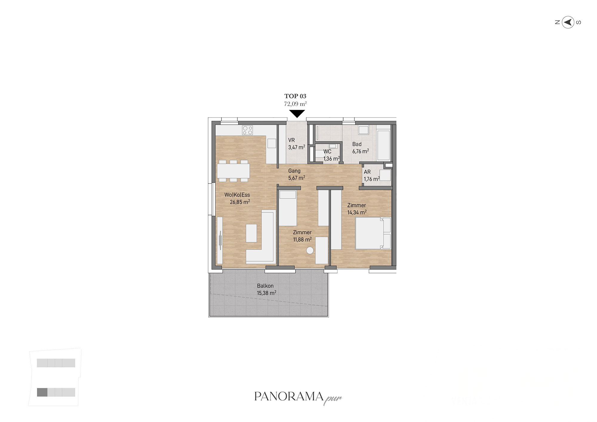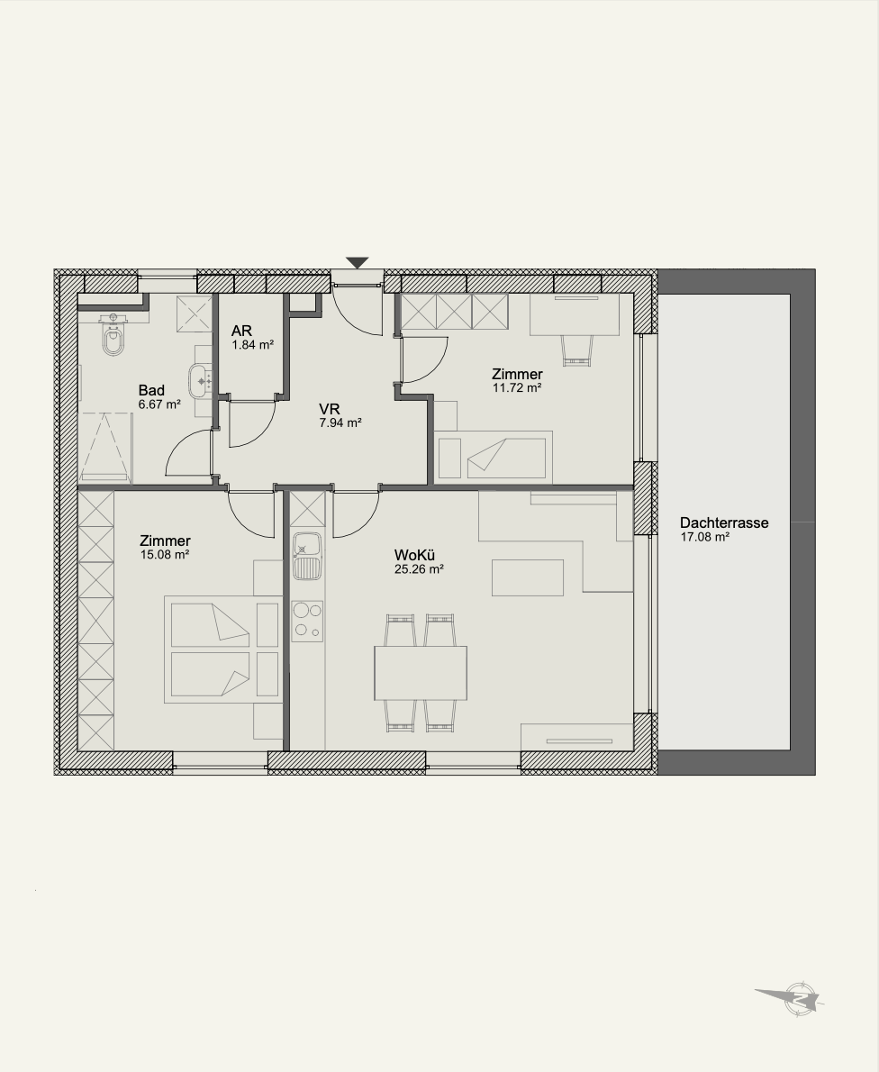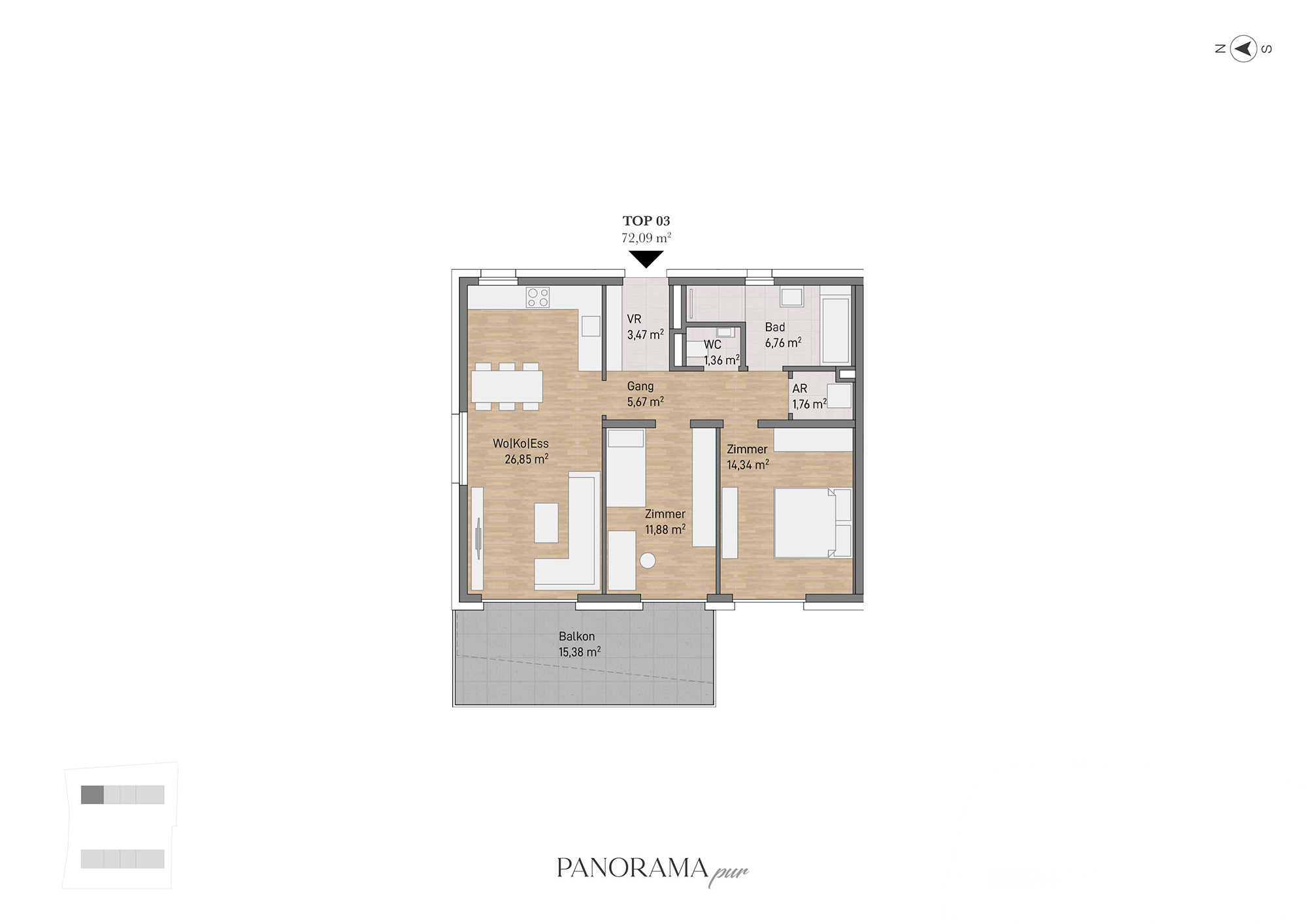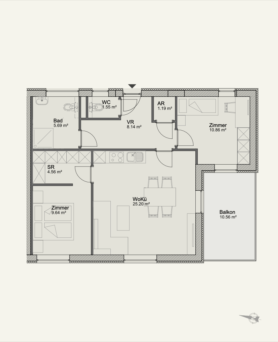 Diese rund 77 m² große Wohnung im 2. Obergeschoss überzeugt mit drei Schlafzimmern, einem großzügigen Wohn-/Essbereich, Badezimmer, separatem WC und einem Vorraum mit Stauraum. Zwei Balkone – einer nach Süden, einer nach Nordosten – bieten sonnige wie schattige Freiflächen und erweitern den Wohnraum ins Grüne.