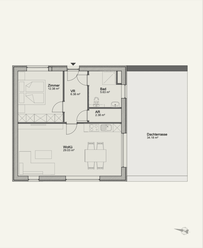 Das 55,6 m² große Penthouse im 3. Obergeschoss kombiniert stilvolles Design mit einer beeindruckenden 33,91 m² großen Dachterrasse, die ideal für entspannte Stunden im Freien ist. Die Wohnung verfügt über einen geräumigen Wohn- und Küchenbereich, ein modernes Bad mit WC sowie ein separates Schlafzimmer. Ein Abstellraum, ein Kellerabteil und ein TG-Stellplatz runden das Angebot ab – ein elegantes Zuhause für anspruchsvolle Stadtbewohner.