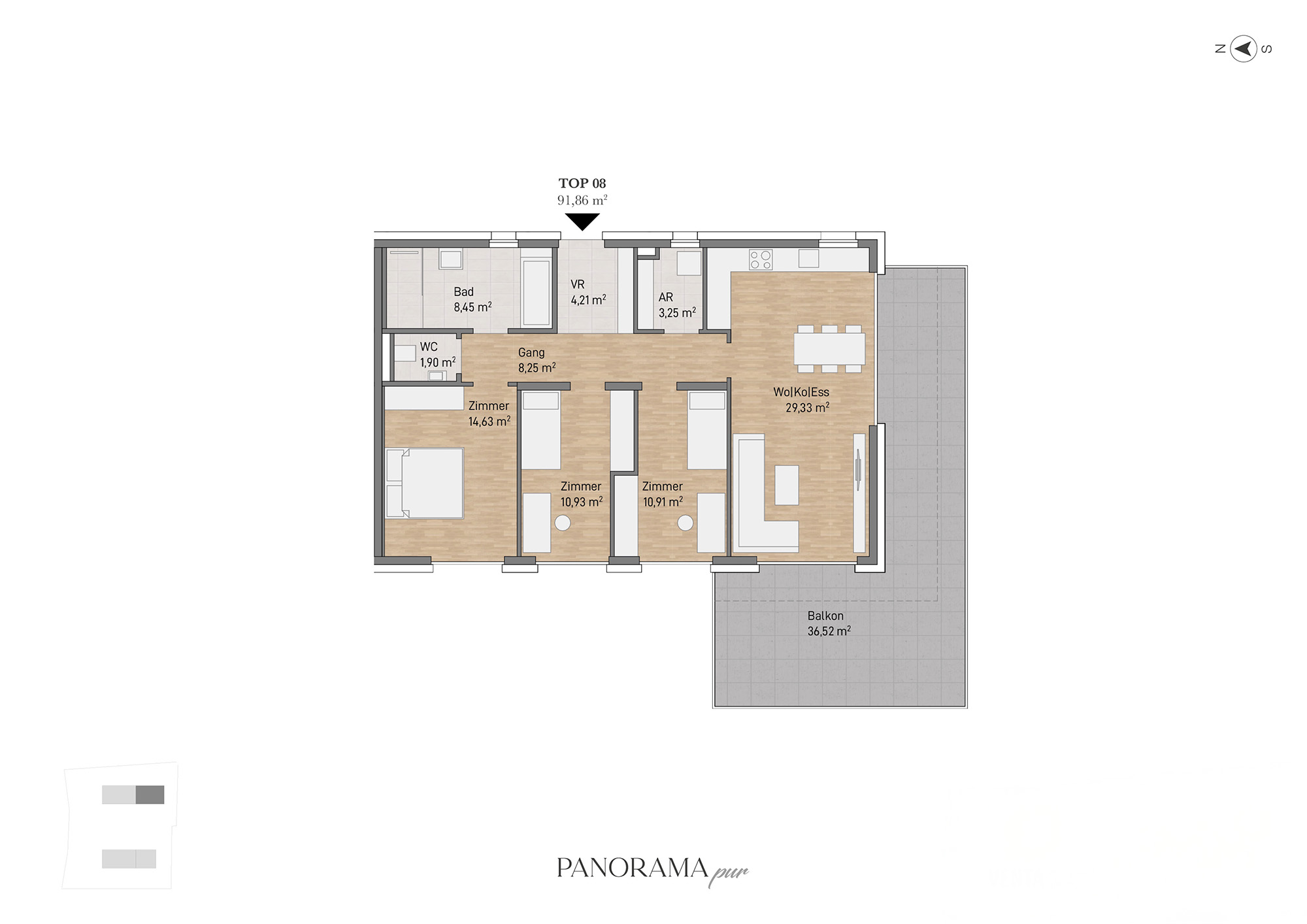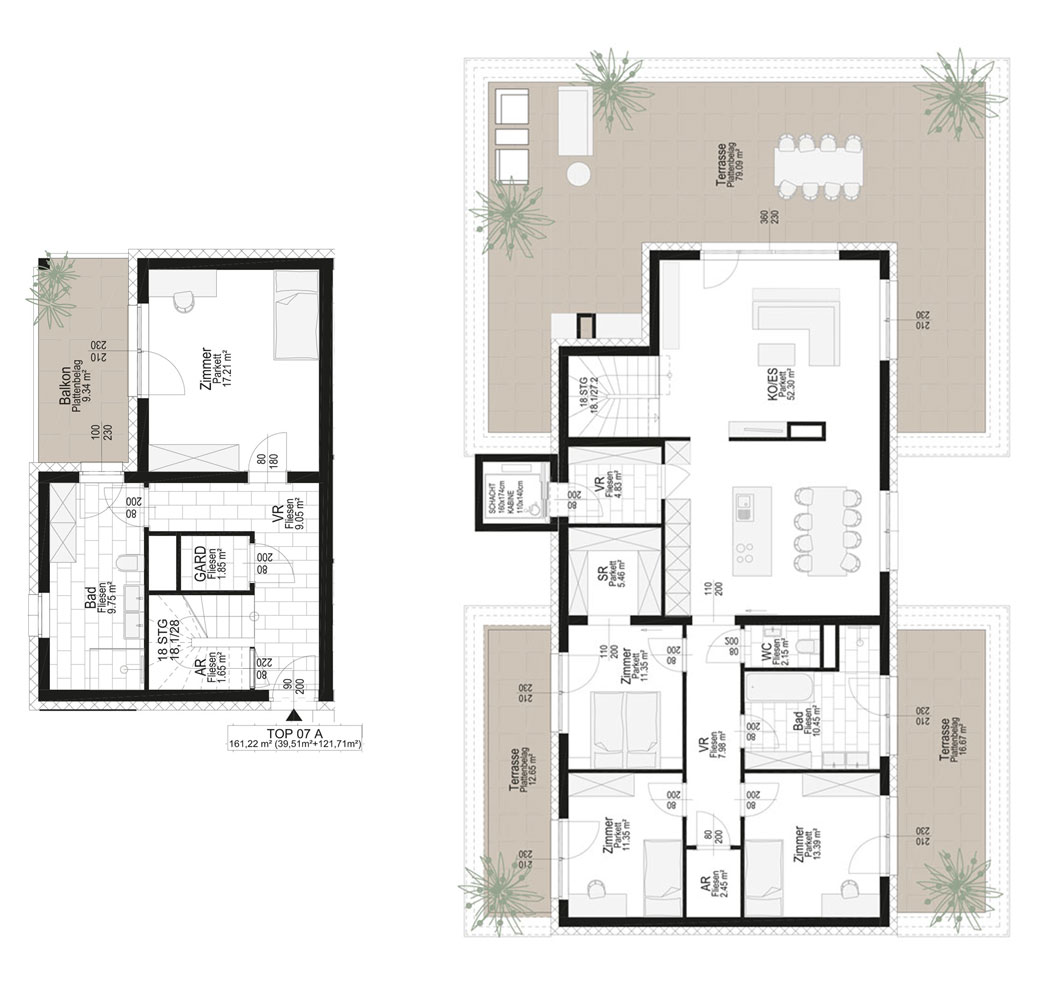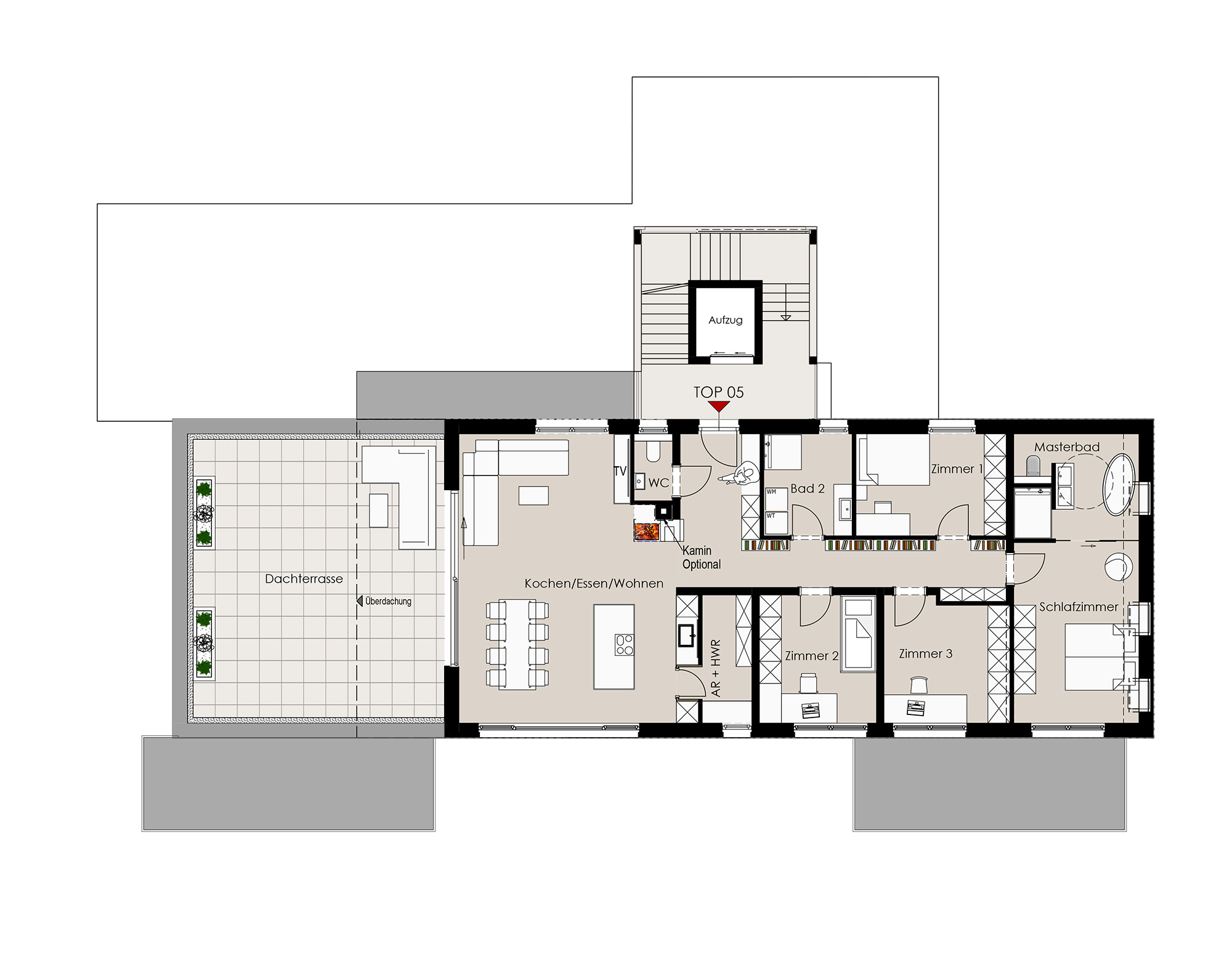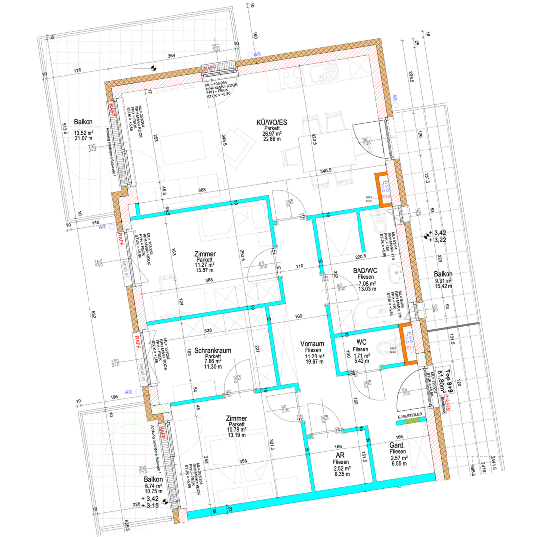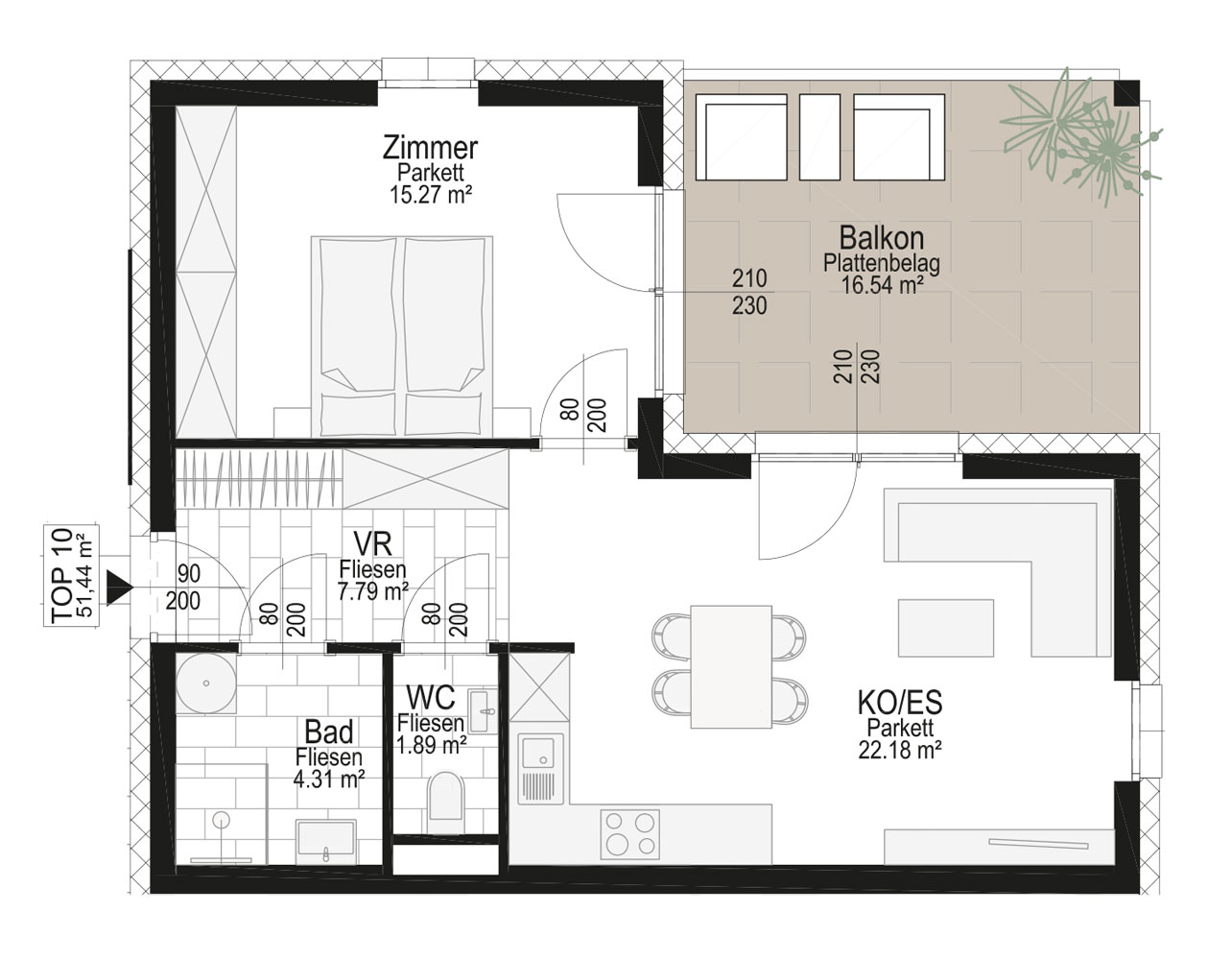 Die Wohnung Top 08/09 mit einer Fläche von 82,9 m² und drei großzügigen Balkon mit zusammen 29,57 m² bietet eine geräumige und einladende Wohnlösung. Der Wohnbereich ist komfortabel und gut gestaltet, was Top 08/09 zu einer idealen Wahl für Paare und kleine Familien macht. Die großzügigen Balkone bieten zusätzlichen Platz im Freien und die Möglichkeit, die frische Luft und die Sonne zu genießen.