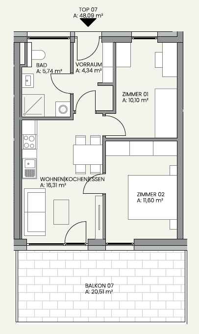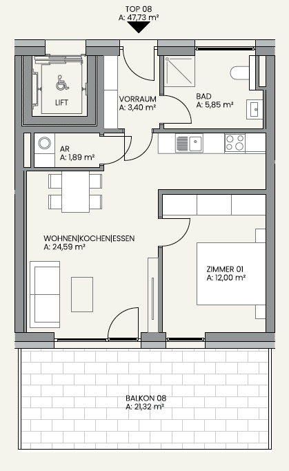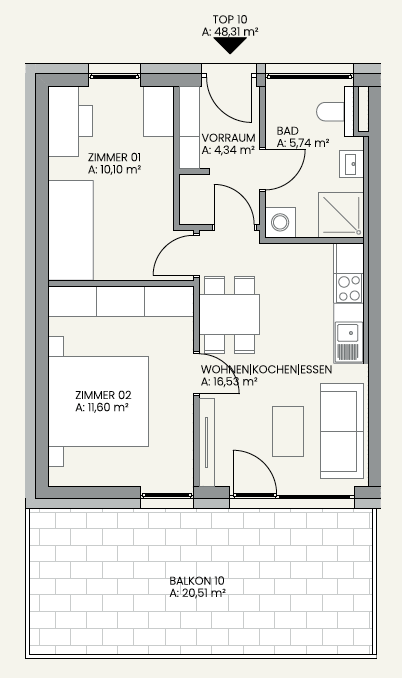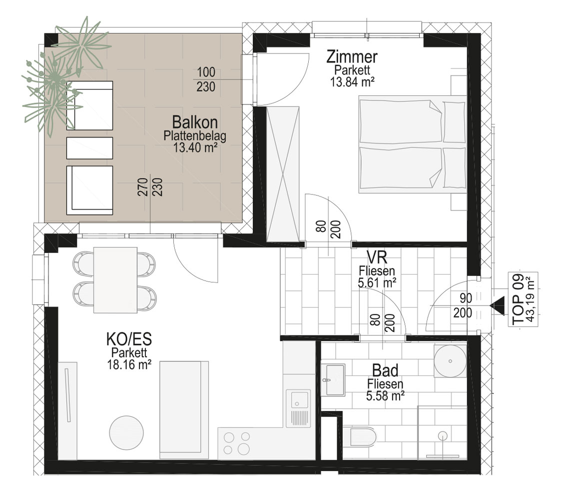 Diese ca. 43 m² große Wohnung verfügt über einen offenen Wohn-/Essbereich, ein geräumiges Schlafzimmer, Bad und Vorraum. Der großzügige Balkon mit über 13 m² bietet sonnige Erholungsfläche im Freien.