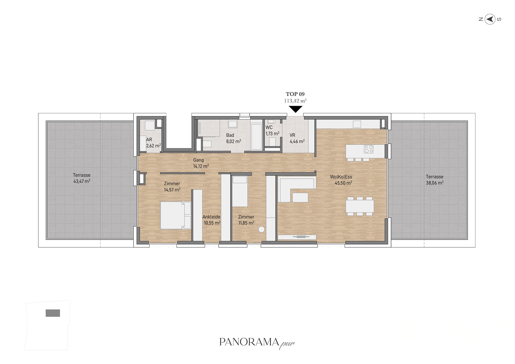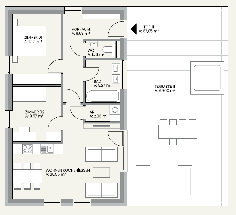 Das Penthouse im 2. Obergeschoss überzeugt mit 67,05 m² Wohnfläche und einer 69,00 m² großen Terrasse, die viel Platz für Entspannung, gesellige Abende oder einen Whirlpool bietet.
