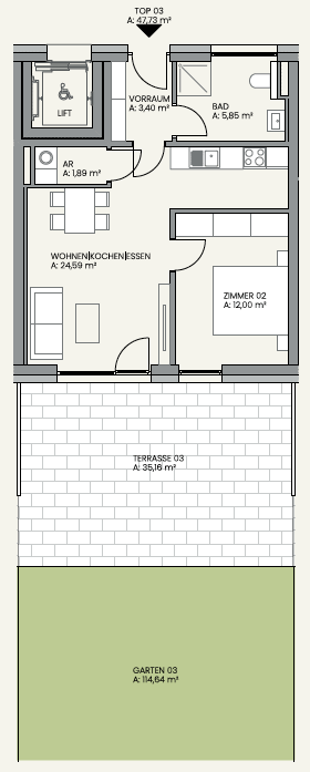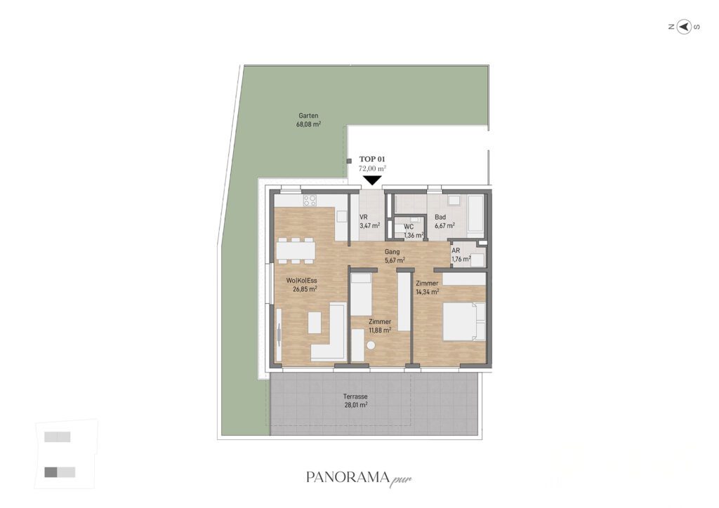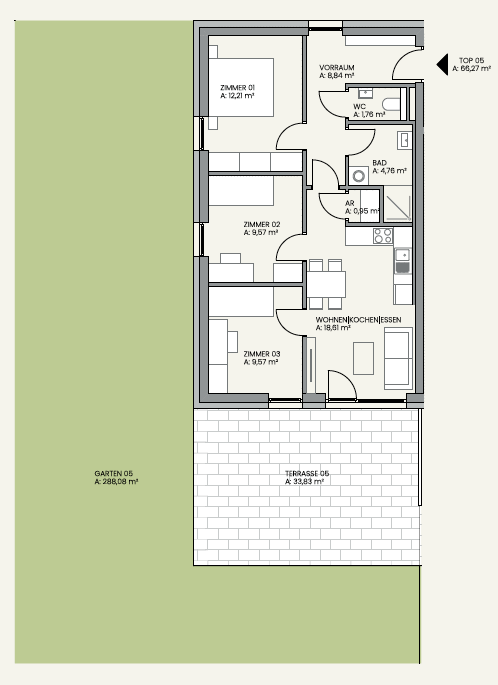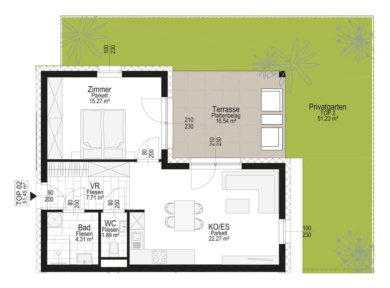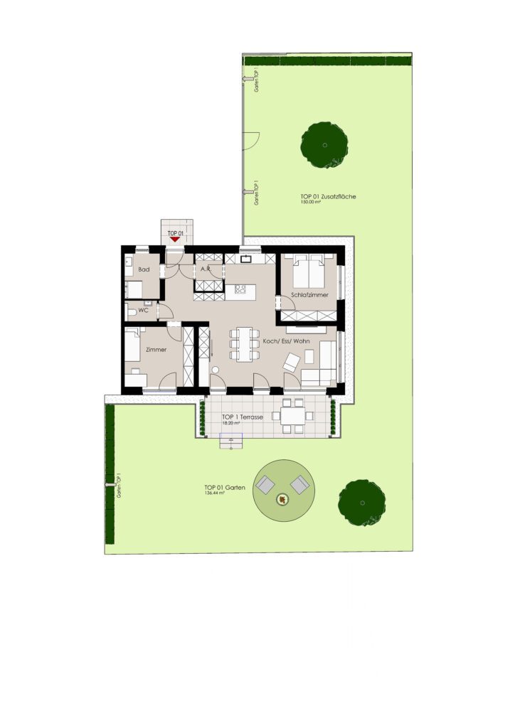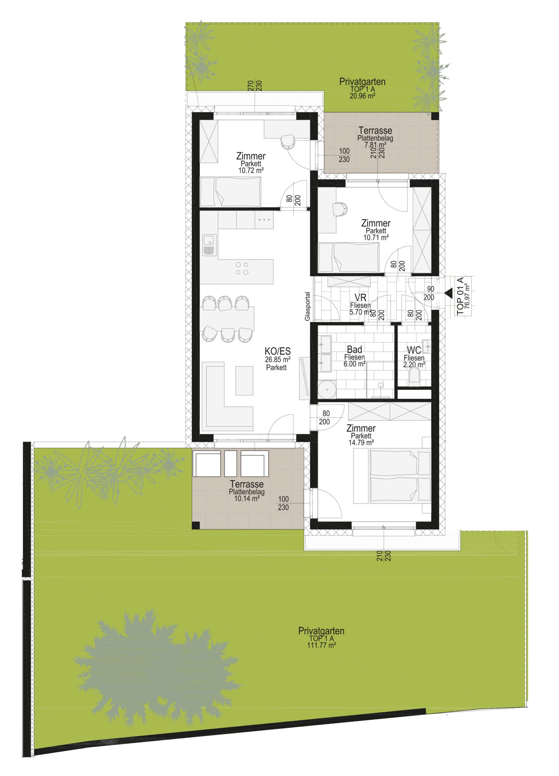 Die Wohnung Top 01 im Erdgeschoss bietet auf 75,41 m² ein durchdachtes Wohnkonzept mit zwei hellen Schlafzimmern, einem großzügigen Wohn-, Ess- und Küchenbereich sowie einem modernen Bad und separatem WC. Die 14,21 m² große Terrasse und der 58,36 m² große Garten schaffen ein ideales Umfeld für Familien oder Paare, die das Leben im Freien genießen möchten.