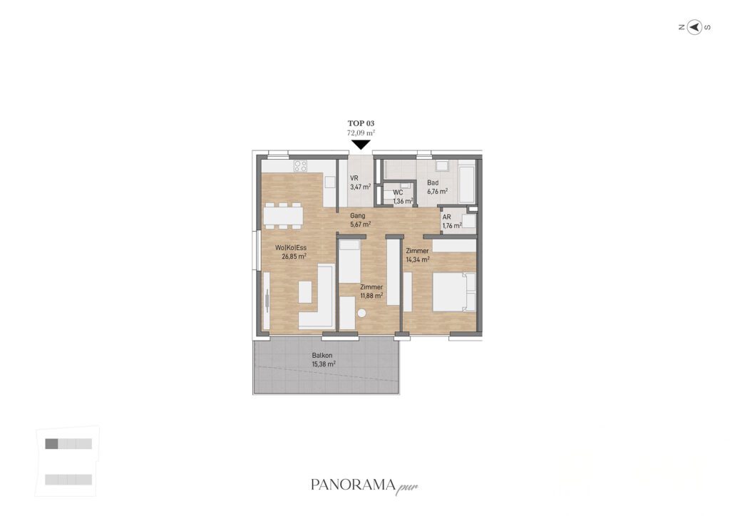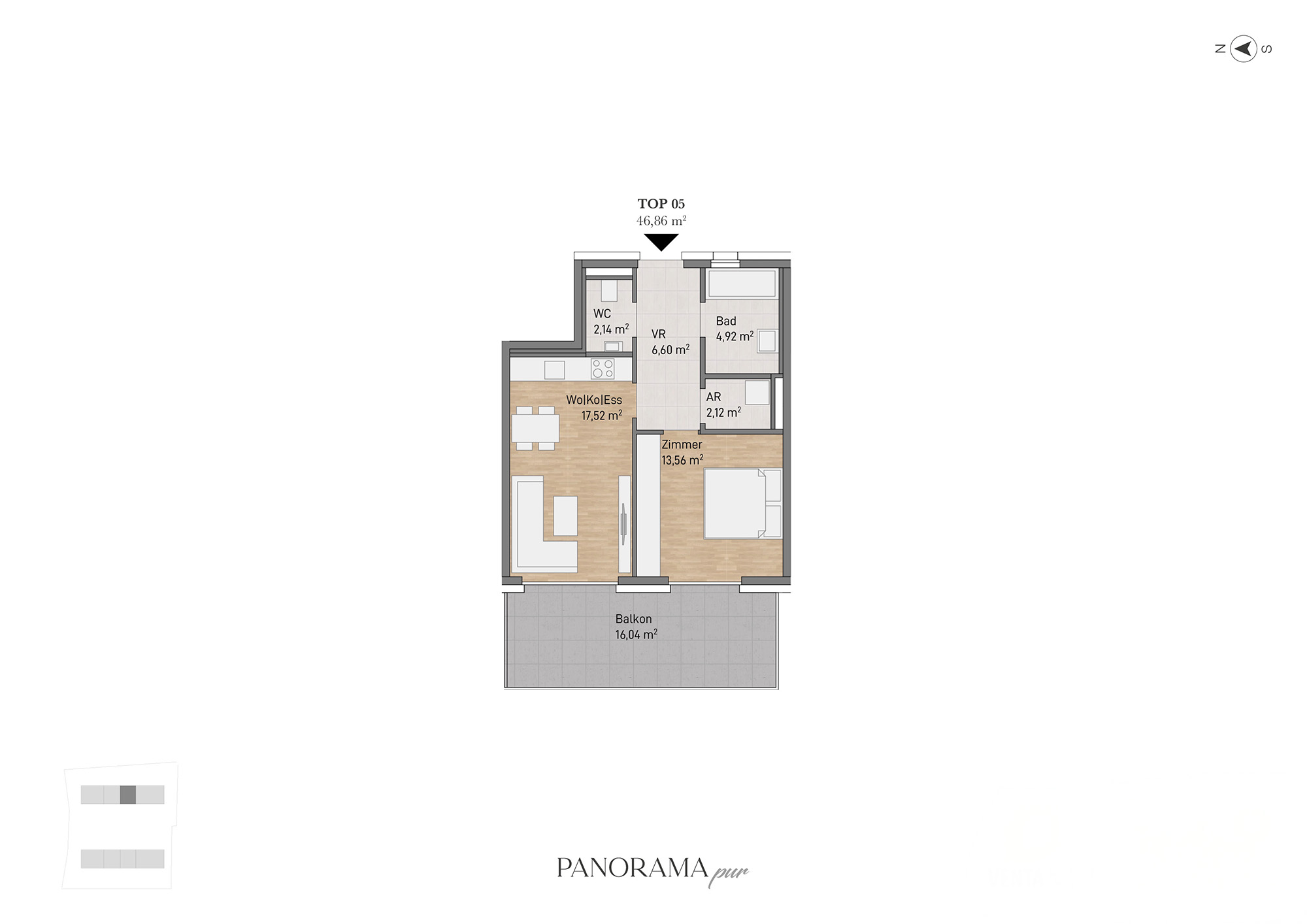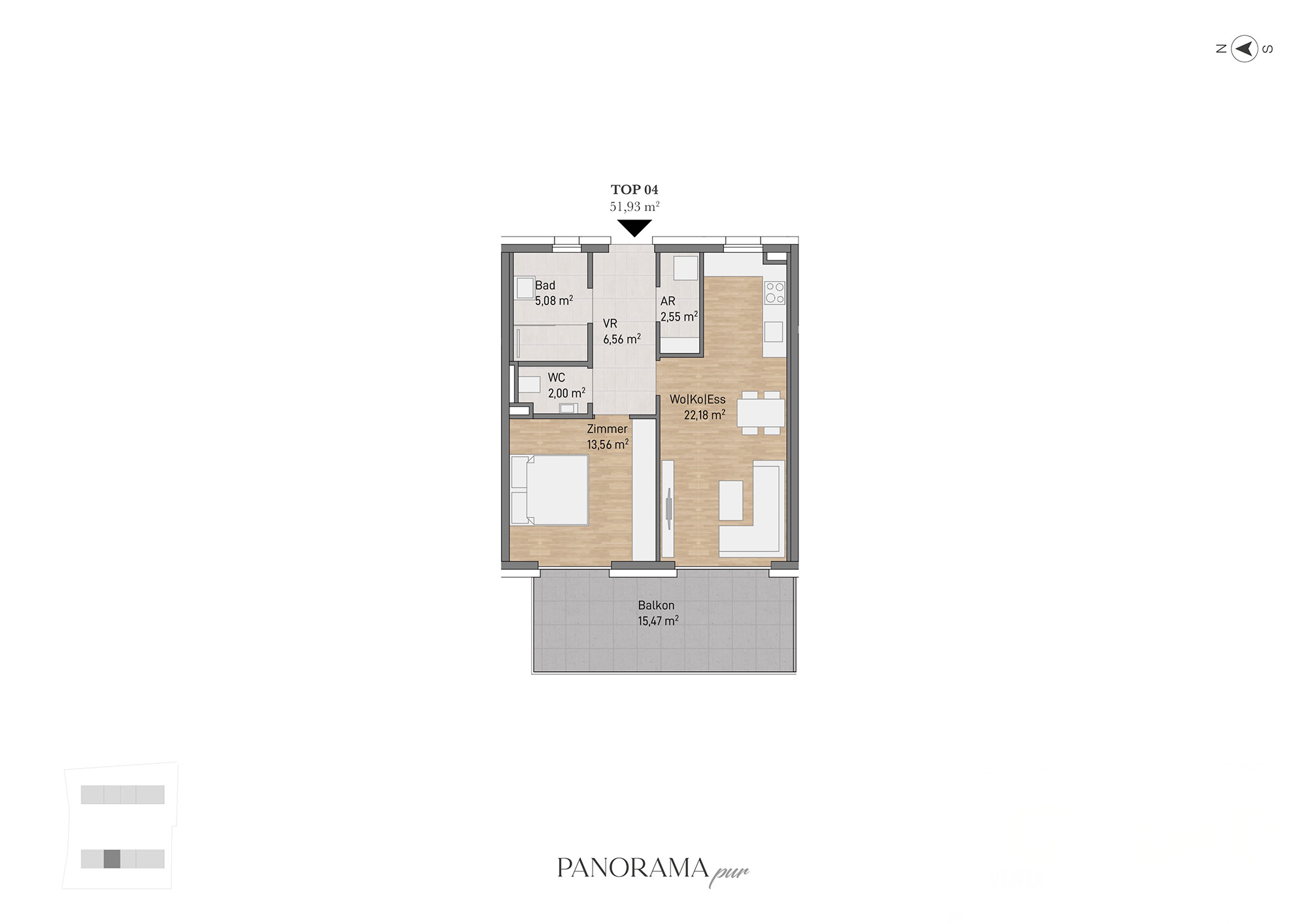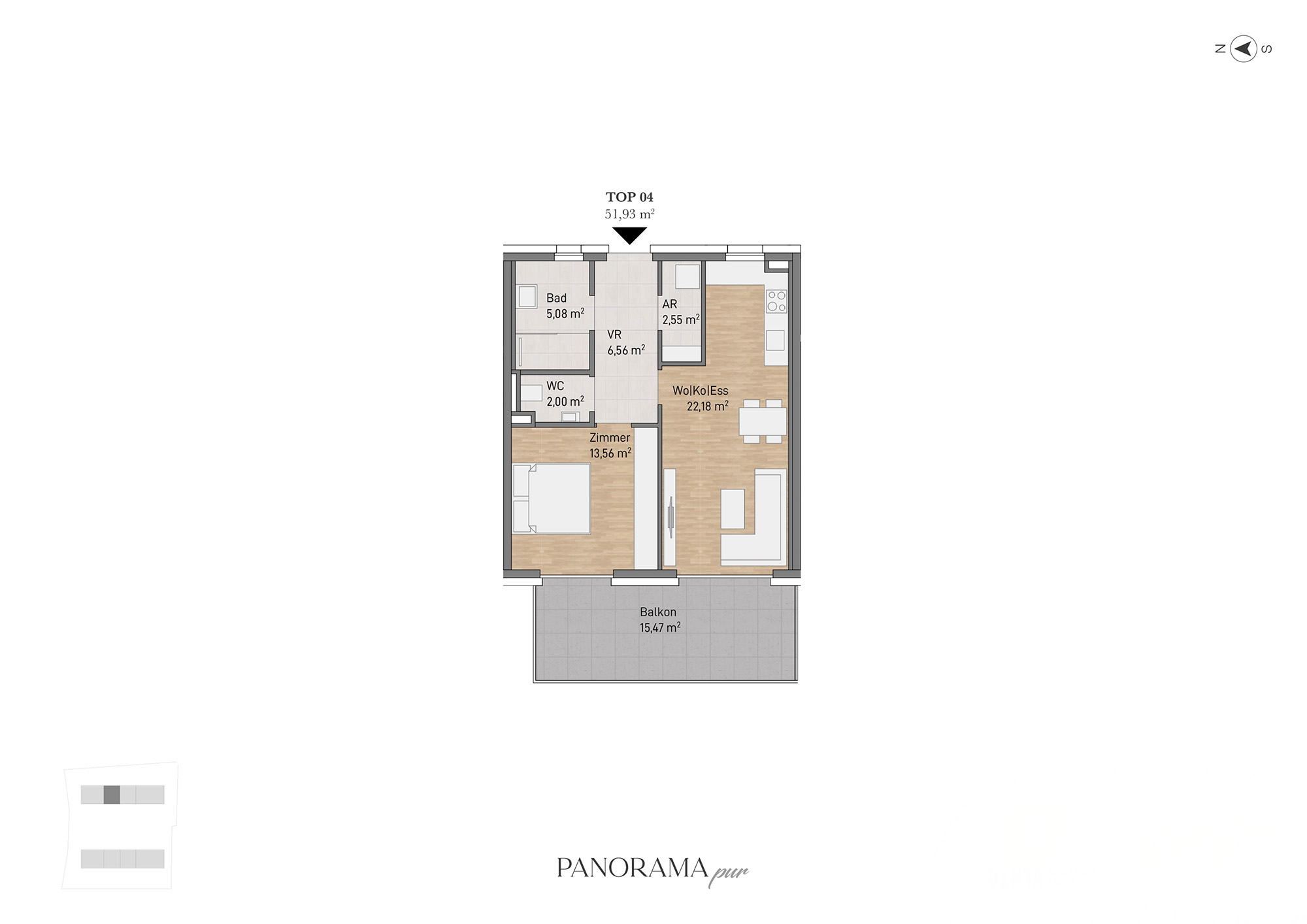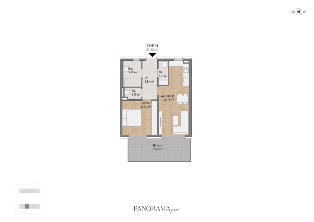 Diese gut aufgeteilte 2-Zimmer-Wohnung überzeugt mit einer offenen Wohnküche, einem großzügigen Schlafzimmer und einem funktionalen Vorraum mit separatem WC. Highlight ist der rund 17 m² große Balkon, der viel Platz für entspannte Stunden im Freien bietet.
