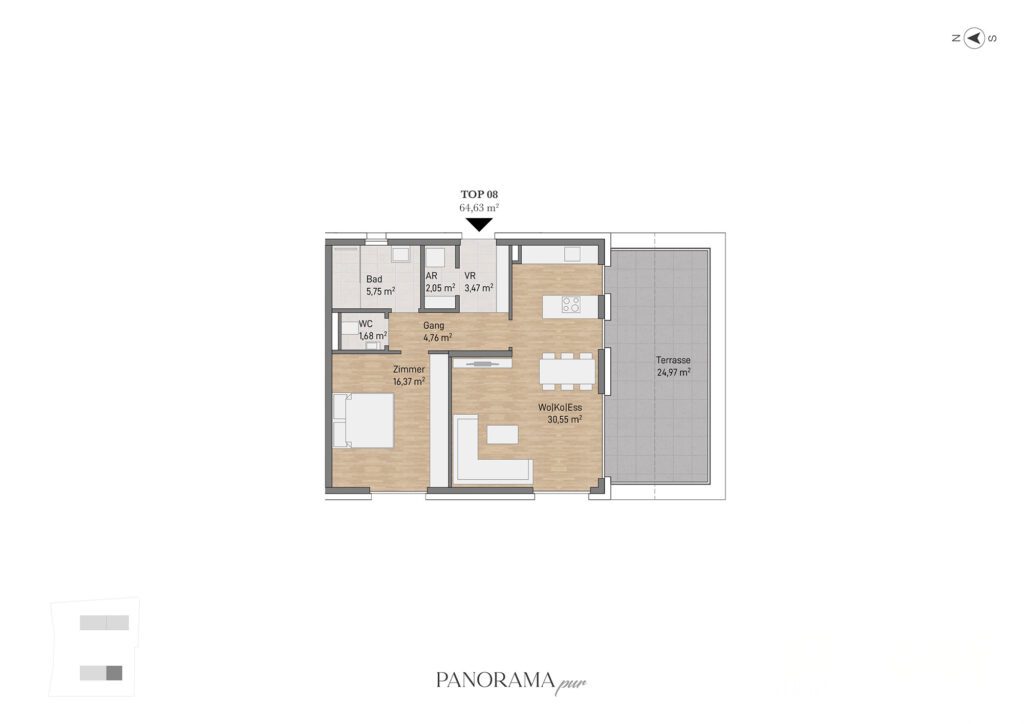 Diese ca. 65 m² große Wohnung im 2. Obergeschoss bietet ein Schlafzimmer, eine großzügige Wohnküche mit über 30 m² sowie gut aufgeteilte Nebenräume. Die rund 25 m² große Terrasse erweitert den Wohnraum ins Freie und schafft Platz zum Entspannen und Erholen.