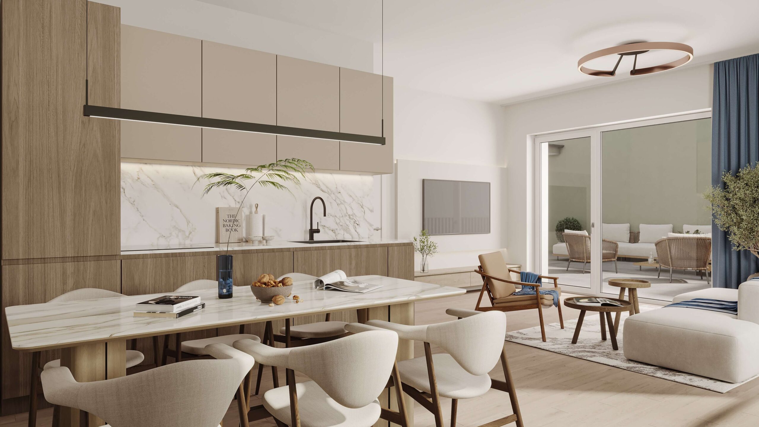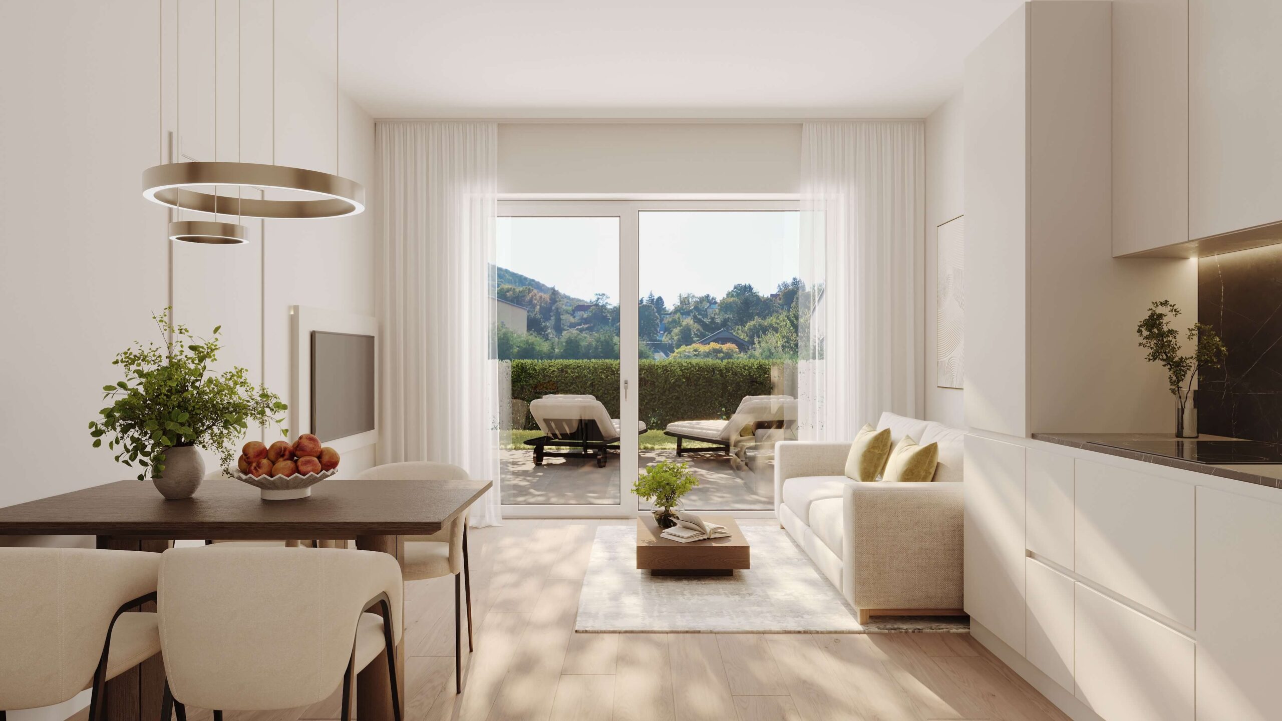 Der offene Wohn-, Koch- und Essbereich ist das Herzstück der Wohnung und bietet dank großer Fenster eine helle, einladende Atmosphäre mit direktem Zugang zur Terrasse. Zwei Schlafzimmer bieten flexible Nutzungsmöglichkeiten.